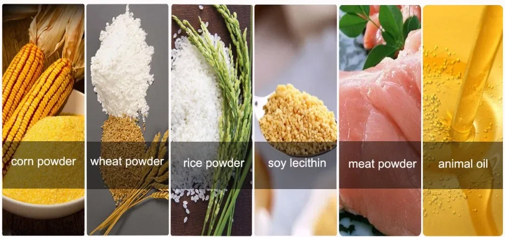 Raw material: Rice flour, corn flour, wheat flour, low temperature soya flakes meal, rice bran , wheat bran, fish powder, bone powder etc.